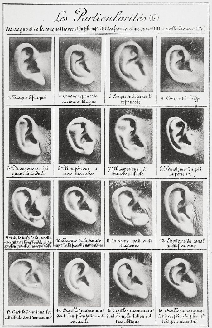 Classificazione degli orecchi in “Identification anthropométrique, instructions signalétiques d’Alphonse Bertillon”, Parigi, 1893 (via Wikimedia)