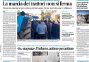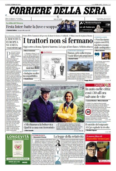 Le notizie principali sulle quali aprono i giornali di oggi sono diverse: le proteste degli agricoltori in Italia, gli attacchi degli Houthi yemeniti nel mar Rosso, la proposta per raggiungere una tregua fra Hamas e Israele bocciata da Hamas, l’applicazione delle misure previste nel PNRR, lo stupro di gruppo di una ragazza a Catania, l’aumento delle spese militari in Italia, e la vittoria nella Serie A di calcio dell’Inter, che aumenta così il suo vantaggio in testa alla classifica, con la Juventus.