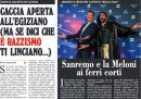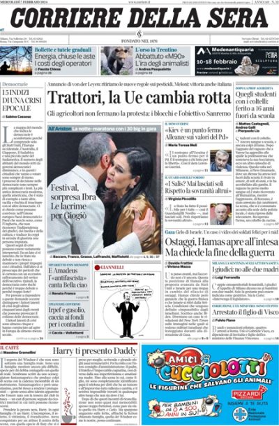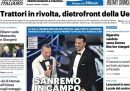 Sono sempre le proteste degli agricoltori la notizia principale in apertura sui giornali di oggi: i titoli riguardano l’annuncio della presidente della Commissione europea von der Leyen di voler ritirare la norma sulla riduzione dell’uso dei pesticidi, la mobilitazione in Italia che ha raggiunto la periferia di Roma, e la possibile partecipazione dei manifestanti al Festival di Sanremo. Su tutte le prime pagine poi molto spazio è dedicato alla prima serata del Festival di Sanremo, che Libero accusa di rappresentare idee di sinistra, Avvenire apre sulle trattative per raggiungere una tregua fra Hamas e Israele, mentre la Verità e il Giornale si occupano dell’azienda Stellantis e degli incontri del suo presidente John Elkann a Roma con diverse cariche istituzionali.