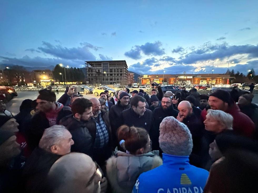 Il ministro Salvini incontra a L’Aquila una delegazione di agricoltori in protesta, 8 febbraio 2024 (Ufficio stampa Lega /ANSA)