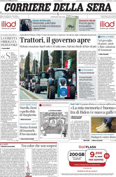 Anche oggi la notizia principale in apertura sui giornali è la protesta degli agricoltori, con l’incontro di ieri fra una loro delegazione e la presidente del Consiglio Meloni che ha proposto il taglio dell’IRPEF sui redditi inferiori a diecimila euro (proposta considerata insufficiente dal leader della Lega Salvini), e la lettura di un comunicato sul palco del Festival di Sanremo da parte del presentatore Amadeus. Il Manifesto e Avvenire titolano invece sulla richiesta israeliana di evacuazione dei civili dalla città di Rafah, nel sud della Striscia di Gaza, il Fatto e la Verità si occupano dell’inchiesta sull’eredità Agnelli nella quale è indagato John Elkann, mentre Libero segue le polemiche sul Festival di Sanremo.