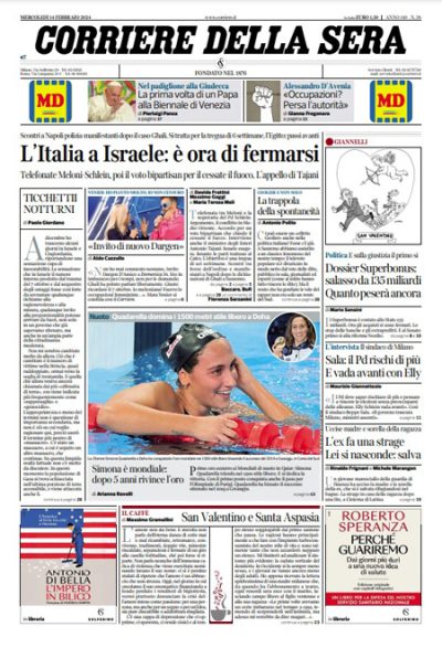 La maggior parte dei giornali di oggi titola in apertura sul voto di ieri alla Camera sulle mozioni della maggioranza e del Partito Democratico sulla guerra a Gaza che chiedono la fine dei combattimenti, voto arrivato dopo una telefonata fra la presidente del Consiglio Meloni e la segretaria del Partito Democratico Schlein per concordare le posizioni dei rispettivi schieramenti. Il Sole 24 Ore apre invece sui dati sull’inflazione negli Stati Uniti, il Manifesto si occupa della detenzione di Ilaria Salis e della decisione del tribunale di Milano di negare l’estradizione in Ungheria di un uomo accusato per la stessa vicenda di Salis, il Fatto titola sulle cariche della polizia durante una manifestazione davanti alla RAI di Napoli, e Libero segue le notizie sull’indagine sull’eredità Agnelli.