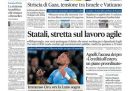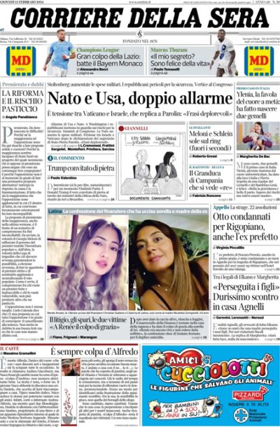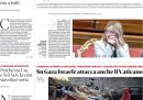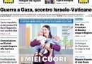 Ci sono notizie diverse in apertura sui giornali di oggi: molti seguono le novità sulla guerra fra Israele e Hamas, con l’andamento delle azioni militari nella Striscia di Gaza e le tensioni diplomatiche fra Vaticano e Israele dopo le critiche dell’ambasciatore israeliano presso la Santa Sede alle parole del cardinale Parolin sulle vittime civili a Gaza. Qualche giornale ipotizza divisioni nella maggioranza di governo dopo il voto di martedì sulla mozione presentata dal Partito Democratico sulla guerra a Gaza e la telefonata fra la segretaria Schlein e la presidente del Consiglio Meloni, il Giornale, il Dubbio e il Riformista aprono sulla riforma della Giustizia approvata dal Senato, Libero e la Verità si occupano dell’eredità Agnelli, e i giornali sportivi commentano la vittoria della Lazio contro il Bayern Monaco nell’andata degli ottavi di finale di Champions League di calcio.