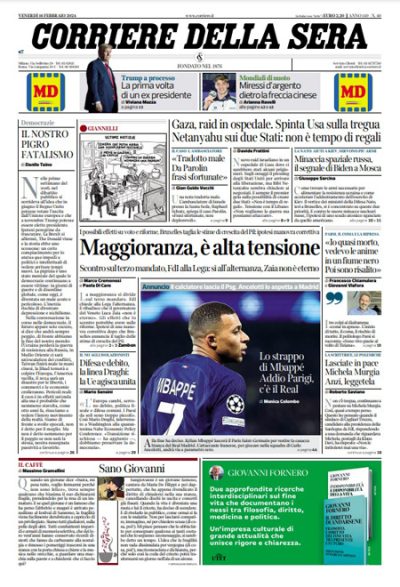 Ci sono notizie diverse in apertura sui giornali di oggi: la guerra fra Hamas e Israele, che ieri ha attaccato un ospedale nella Striscia di Gaza, e le trattative per una tregua sulle quali non sembra si facciano passi avanti, le stime della Commissione europea sulla crescita economica dei paesi dell’Unione Europea, la gestione dei migranti da parte del governo italiano, le divisioni nella maggioranza sulla possibilità di rieleggere per un terzo mandato sindaci e presidenti di regione. Repubblica intervista la segretaria del Partito Democratico Schlein sull’autonomia differenziata per le regioni, il Giornale si occupa dell’elezione del nuovo presidente di Confindustria, Avvenire titola sulla diffusione in Italia del farmaco Fentanyl, il Fatto si occupa dell’eredità Agnelli, e la Verità e il Riformista aprono sulla commissione d’inchiesta sulla gestione della pandemia da Covid-19. I giornali sportivi commentano la vittoria del Milan e il pareggio della Roma nell’andata degli spareggi per la qualificazione agli ottavi di finale di Europa League di calcio.