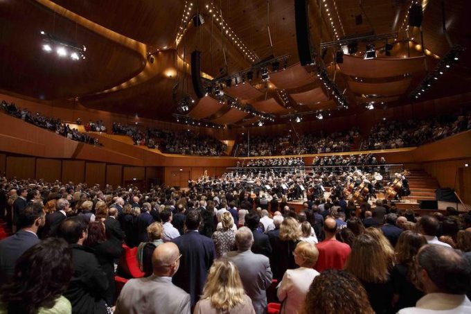Intanto perché si possono vedere i musicisti, i loro gesti, le loro espressioni: e infatti molto dell’esperienza cambia a seconda di dove si è seduti, e di come è progettata la disposizione dei posti a sedere, che quando sono pieni possono diventare a loro volta parte dello spettacolo. Una sala da concerto poi è sempre progettata per essere bella anche da vedere, che si tratti di un teatro settecentesco pieno di stucchi sfarzosi e lampadari o di una sala contemporanea dalle linee avveniristiche.