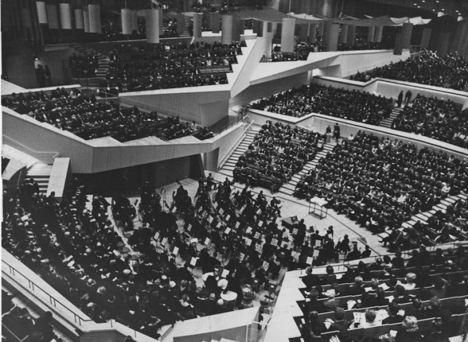 A questa concezione si affiancò a partire dalla metà del Novecento quella cosiddetta “a vigneto”, in cui i posti a sedere sono posizionati tutto intorno a un palco centrale. Il modello più celebre è quello della Philharmonie di Berlino, inaugurata nel 1963 e progettata dall’architetto Hans Scharoun e dotata sia di un’acustica formidabile, garantita dalle superfici convesse delle pareti e del soffitto, sia di una conformazione che avvicina moltissimo gli spettatori al palco, abbattendo le tradizionali distanze fisiche e simboliche tra pubblico e orchestra.