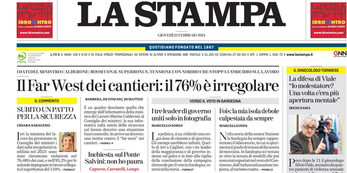 L’apertura dei giornali di oggi è dedicata a notizie diverse: mentre alcuni si occupano di Alexei Navalny con le ipotesi su quali possano essere state le cause della sua morte, altri titolano sulla sicurezza del lavoro, con i dati comunicati dalla ministra del Lavoro Calderone al Consiglio dei ministri sugli incidenti sul lavoro e sui controlli. Altri giornali aprono sull’indagine avviata dalla procura di Roma sulle procedure per la progettazione e costruzione del ponte sullo Stretto di Messina, altri ancora rimangono sulla politica italiana, con la discussione nella maggioranza sull’ipotesi di consentire un terzo mandato per presidenti di regione e sindaci e con la campagna elettorale per le elezioni regionali in Sardegna, mentre il Fatto si occupa dell’udienza a Londra per l’estradizione di Julian Assange, il Sole 24 Ore e Libero titolano sulla revisione del sistema delle sanzioni fiscali, la Verità sui rapporti commerciali fra Italia e Russia, e Domani sulla versione del sottosegretario Delmastro sul ferimento di una persona con un colpo di pistola durante una festa di Capodanno. I giornali sportivi aprono sul pareggio fra Napoli e Barcellona nell’andata degli ottavi di finale di Champions League di calcio.