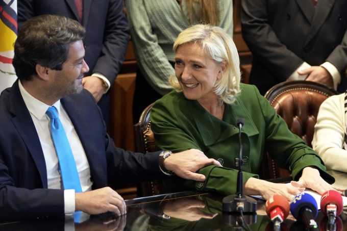 André Ventura, leader di Chega, e Marine Le Pen, leader dell’estrema destra francese, Lisbona, 24 novembre 2023 (AP Photo/Armando Franca)