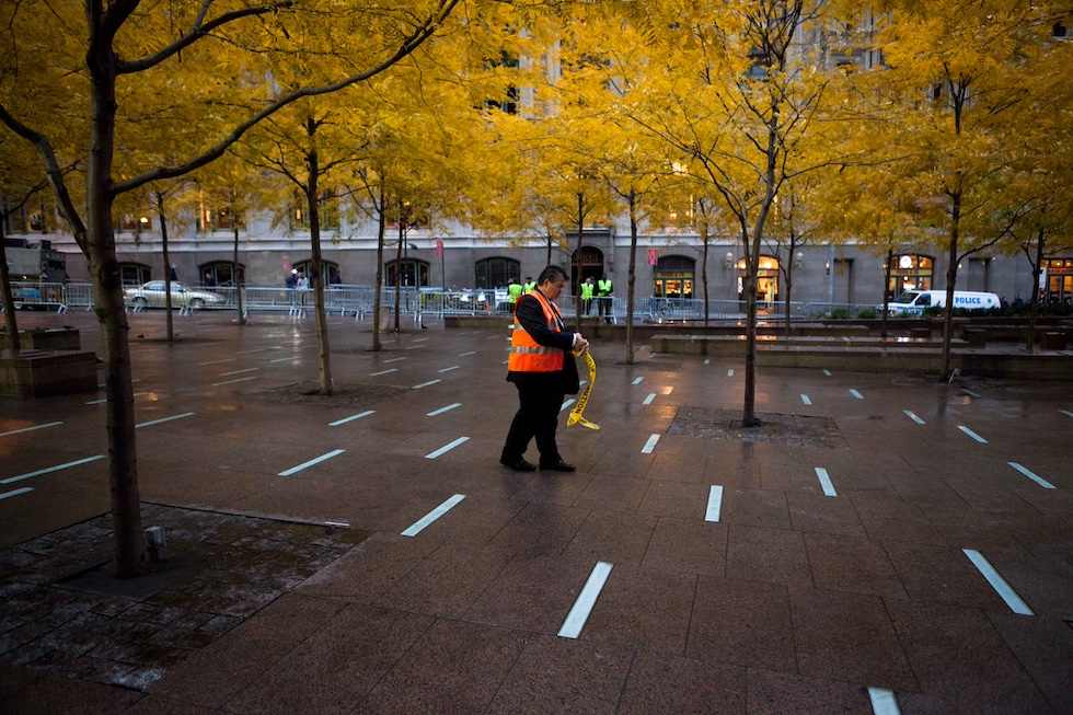Zuccotti Park dopo lo sgombero degli attivisti di Occupy Wall Street, nel 2011 (AP Photo/John Minchillo)