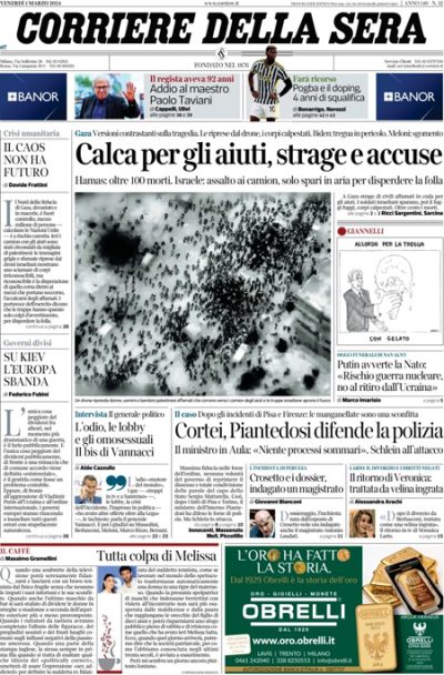 Le due notizie principali in apertura sui giornali di oggi sono la strage di civili palestinesi a Gaza uccisi mentre aspettavano la distribuzione di aiuti alimentari, per gli spari dell’esercito israeliano secondo le autorità palestinesi e per la calca secondo Israele, e l’informativa in parlamento sulle violenze della polizia durante le manifestazioni di studenti della settimana scorsa a Pisa e Firenze del ministro dell’Interno Piantedosi, che ha difeso i comportamenti delle forze dell’ordine. Il Sole 24 Ore titola sul calo dell’inflazione negli Stati Uniti e in Germania, e il Fatto apre sulle trattative diplomatiche per una tregua nella guerra fra Russia e Ucraina.