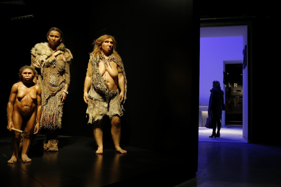 Da sinistra a destra, una ricostruzione di Homo floresiensis, Homo sapiens e Homo neanderthalensis al Musee des Confluences, un museo di scienza e antropologia a Lione, in Francia, il 18 dicembre 2014 (AP Photo/Laurent Cipriani)
