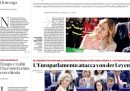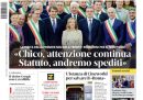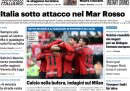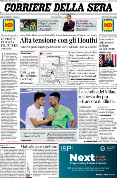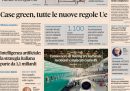 Ci sono notizie diverse in apertura sui giornali di oggi: alcuni si occupano dei due droni lanciati dagli houthi nel mar Rosso che sono stati abbattuti dalla nave militare italiana Caio Duilio e delle minacce all’Italia per la partecipazione alla missione militare, altri esaminano le conseguenze politiche del voto per le elezioni regionali in Abruzzo di domenica scorsa, altri ancora titolano sulla direttiva europea sull’efficienza energetica delle abitazioni approvata dal parlamento europeo. Qualche giornale segue poi l’inchiesta della procura di Perugia sui presunti “dossier” su politici e personaggi famosi, Repubblica critica il decreto sulla riscossione dei debiti fiscali, il Manifesto apre sulla scelta del candidato del centrosinistra per le prossime elezioni regionali in Basilicata, e Avvenire sulle preoccupazioni per la diffusione in Italia del farmaco Fentanyl. I giornali sportivi si occupano dell’indagine della procura di Milano sulla proprietà del Milan e commentano l’eliminazione del Napoli in Champions League.