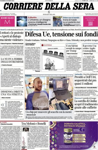 La maggior parte dei giornali di oggi si occupa in apertura della riunione del Consiglio europeo nella quale si è discusso dei rapporti con la Russia, del sostegno militare all’Ucraina per la guerra, dell’ipotesi di approntare un sistema di difesa comune fra i paesi dell’Unione Europea e della guerra fra Israele e Gaza. Qualche giornale apre invece sull’inchiesta sui rapporti fra mafia e politica a Bari, mentre il Giornale titola sulle proteste contro Israele nelle università italiane.