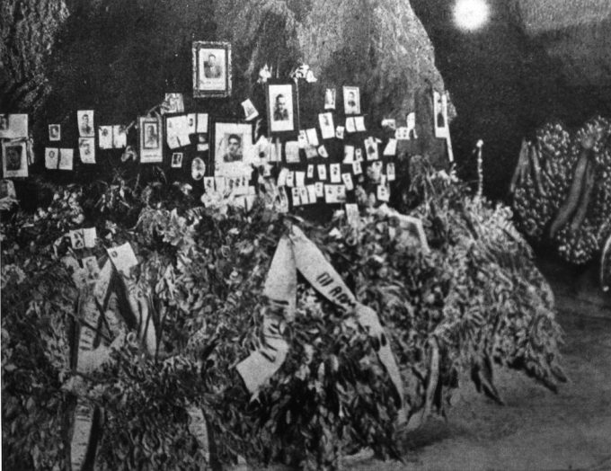 Le foto delle persone morte alle Fosse Ardeatine sulle pareti della cava sistemate dai parenti subito dopo la Liberazione da parte degli Alleati (ANSA)