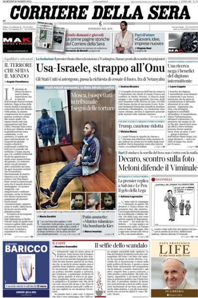 La notizia sulla quale apre la maggior parte dei giornali di oggi è la risoluzione approvata ieri dal Consiglio di sicurezza delle Nazioni Unite con l’astensione degli Stati Uniti che chiede un cessate il fuoco immediato nella Striscia di Gaza per il periodo del Ramadan e la liberazione degli ostaggi israeliani presi da Hamas negli attacchi del 7 ottobre scorso. Repubblica titola invece sulla preoccupazione per nuovi attentati islamisti in Europa, Libero e la Verità si occupano della vicenda delle presunte infiltrazioni mafiose al comune di Bari, e il Messaggero apre sulla norma che prevede test attitudinali per i magistrati che dovrebbe essere discussa nel Consiglio dei ministri di oggi.
