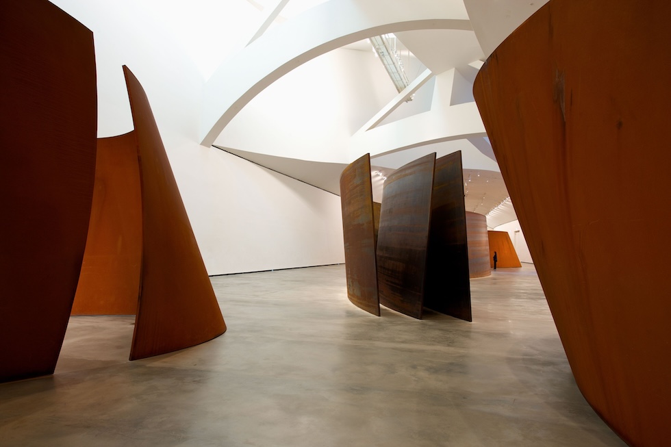 Una delle sue opere più note, La materia del tempo, occupa l’atrio principale del Museo Guggenheim di Bilbao, in Spagna, ed è fatta di 1.034 tonnellate di acciaio ossidato. Come tutte le opere di Serra è studiata per erigersi senza bisogno di sostegni o ancoraggi, nonostante il suo ridotto spessore.