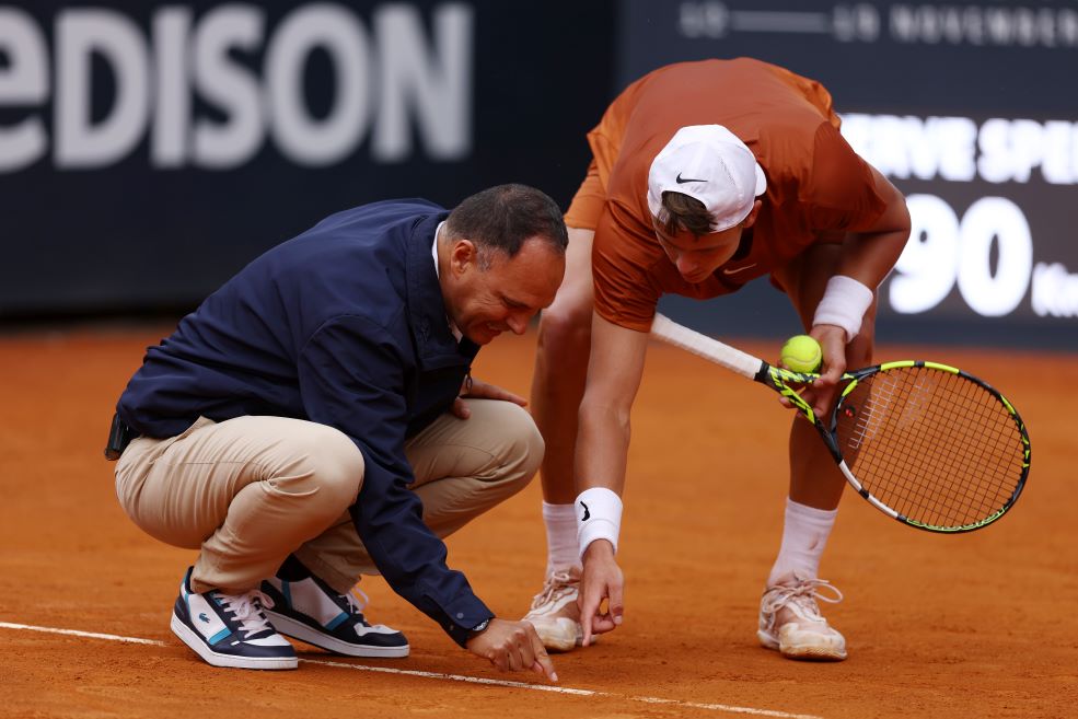 Il tennista danese Holger Rune controlla con l’arbitro il segno lasciato da una pallina sulla terra rossa (Alex Pantling/Getty Images)