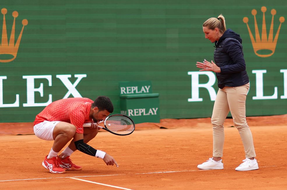 Il tennista serbo Novak Djokovic, numero 1 al mondo, discute con una giudice di sedia su una chiamata dubbia (Clive Brunskill/Getty Images)