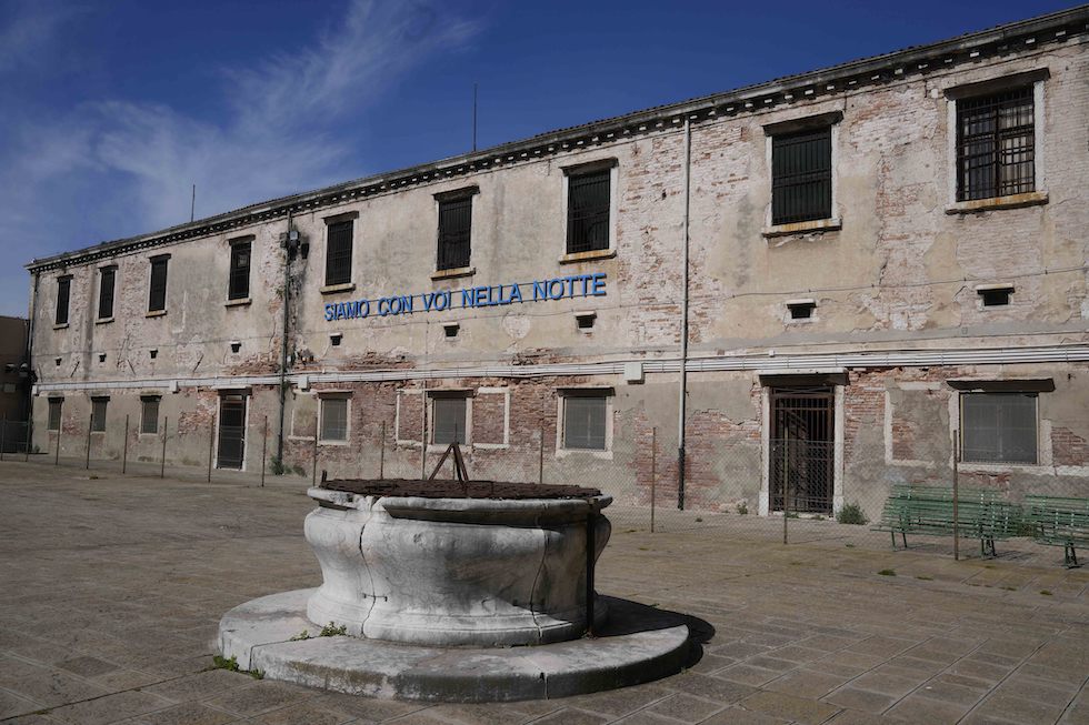 La scritto al neon “Siamo con voi nella notte” del collettivo Claire Fontaine nella Casa di reclusione femminile della Giudecca che ospita il padiglione del Vaticano alla 60esima edizione della Biennale d’arte di Venezia, 17 aprile 2024 (AP Photo/Luca Bruno)