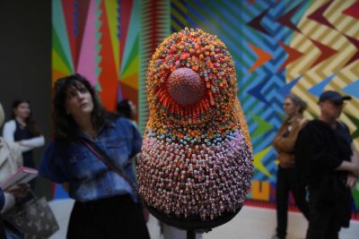 L’artista Jeffrey Gibson nel padiglione degli Stati Uniti da lui allestito per la 60esima edizione della Biennale d’arte di Venezia, 16 aprile 2024 (AP Photo/Luca Bruno)
