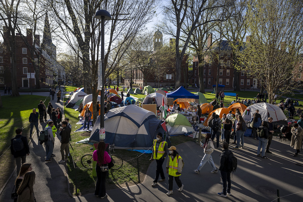 Campus di Harvard, Cambridge, 25 aprile 2024 (AP Photo/Ben Curtis)
