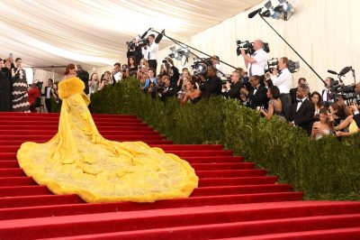 Da allora molti associano l’evento a una baracconata dove i personaggi famosi fanno a gara a vestirsi in modo eccentrico per far parlare di sé sui social: ricorderete forse Jared Leto travestito da Choupette, la gatta dello stilista tedesco Karl Lagerfeld, la cantante Katy Perry vestita da candelabro o Kim Kardashian con un abito di Balenciaga nero che la fasciava e nascondeva interamente, anche il viso. In parte questo si spiega perché il Met Gala è una festa a tema e il tema è piuttosto complicato da seguire perché è quello della mostra annuale organizzata dal Costume Institute, il dipartimento del Metropolitan Museum di New York dedicato alla moda: può essere un omaggio a uno stilista o un argomento più vasto, come il camp, la moda americana del Novecento, il passare del tempo, la tecnologia o l’influenza della Chiesa cattolica sulla moda.