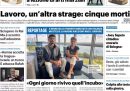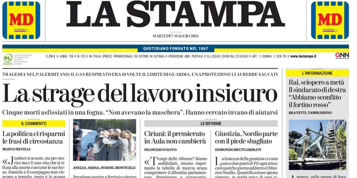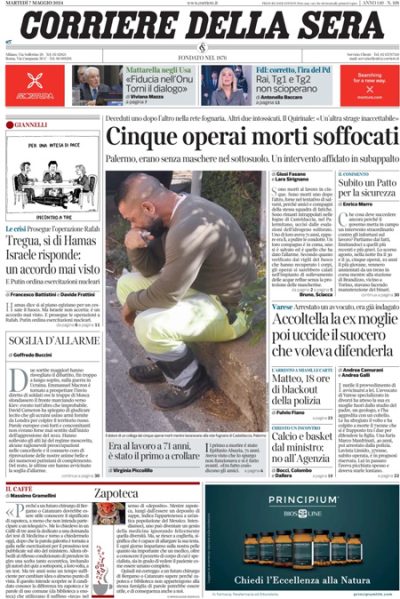 Sulla maggior parte dei giornali di oggi la notizia principale è la morte a Casteldaccia, vicino a Palermo, di cinque operai che stavano facendo lavori di manutenzione nelle fogne per aver respirato fumi tossici. Le altre notizie più importanti sono la proposta di tregua fra Hamas e Israele presentata da Qatar e Egitto e accettata da Hamas, mentre Israele la sta ancora valutando, lo sciopero di ieri dei giornalisti della RAI, le esercitazioni militari russe con armi nucleari al confine con l’Ucraina e le iniziative diplomatiche per cercare di porre fine al conflitto fra Russia e Ucraina.