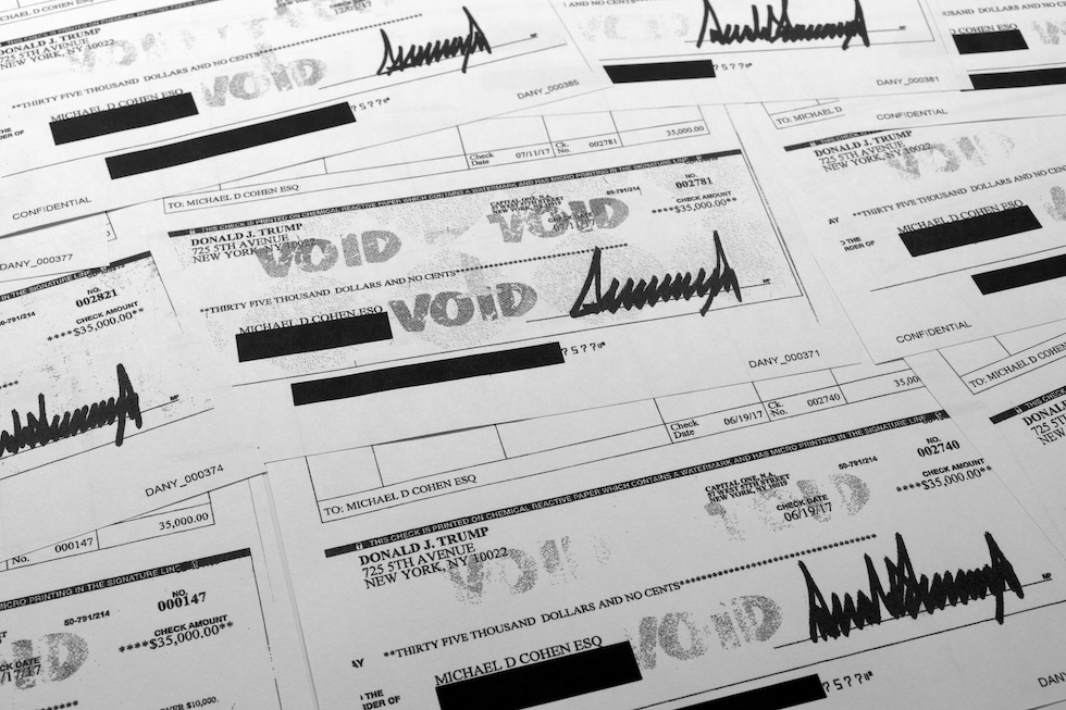 Copie degli assegni di Trump a Cohen presentati come prove nel processo (AP Photo/Jon Elswick)