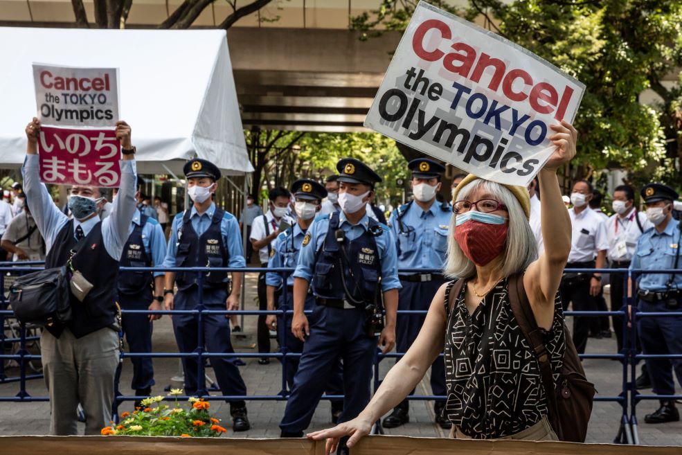 Le Olimpiadi di Tokyo si svolsero con un anno di ritardo e tra le proteste (come questa) dei cittadini giapponesi, preoccupati dalla pandemia (Yuichi Yamazaki/Getty Images)