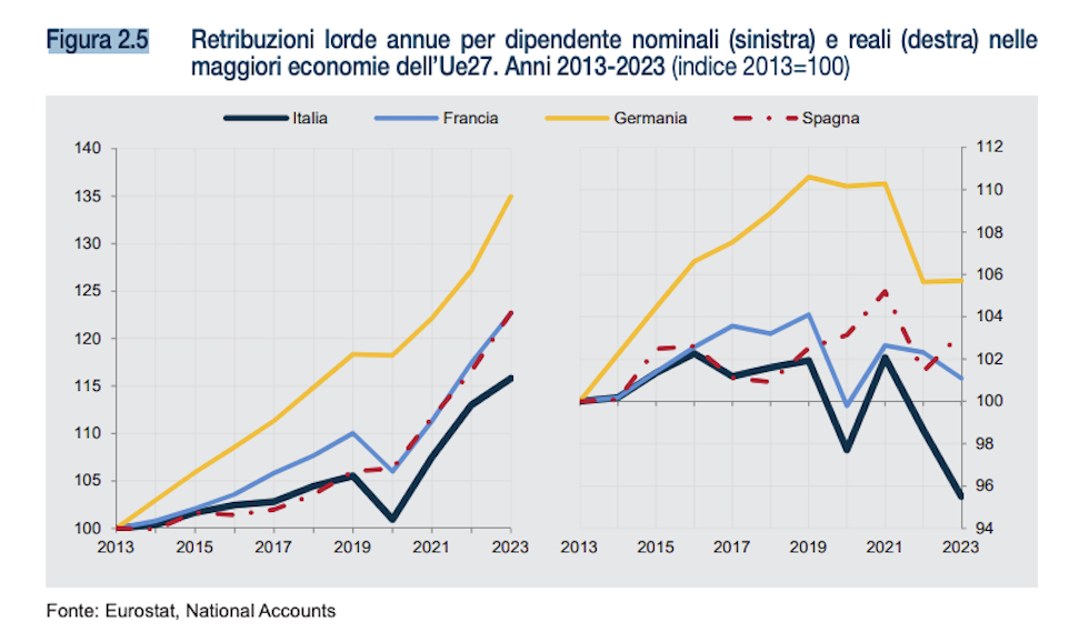 Questa tendenza, piuttosto costante nel corso di un intero decennio, si è manifestata ancora nel 2023: lo scorso anno, l’aumento degli stipendi in Italia è stato del 2,5 per cento, in Francia del 4,4 per cento, in Spagna del 5,3 e in Germania del 6,1 per cento.