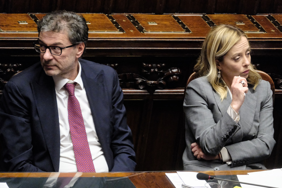 Giorgia Meloni col ministro dell’Economia Giancarlo Giorgetti alla Camera, il 12 dicembre 2023 (Mauro Scrobogna/LaPresse)