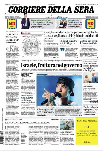 I principali giornali di oggi hanno titoli dedicati a temi diversi: i possibili problemi nel governo di Israele per il Corriere, l’inchiesta di Genova sul presidente della Liguria Giovanni Toti su Repubblica, un’intervista a Ilaria Salis sulla Stampa, i buoni risultati della Borsa sul Sole 24 Ore. La gran parte dei giornali riserva uno spazio in prima pagina al ritorno in Italia di Chico Forti: è il titolo di apertura soprattutto dei giornali conservatori, con toni celebrativi, il Fatto Quotidiano è invece polemico sull’accoglienza riservata a Forti. Il Manifesto apre sulla manifestazione dei movimenti LGBT+ in programma a Roma, i quotidiani sportivi sui problemi societari della squadra di calcio dell’Inter.