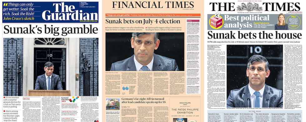 Sunak invece ha annunciato elezioni a luglio, anticipandole dunque di poco, tre-quattro mesi, ma comunque assumendosi alcuni rischi: il Financial Times ha parlato di una «scommessa» del primo ministro; un opinionista del Guardian di un «azzardo stupefacente»; il Times ha scritto che Sunak sta «giocando d’azzardo» e l’Economist ha scritto che la decisione di Sunak «potrebbe essere un atto di genio politico o di follia, ma probabilmente follia».