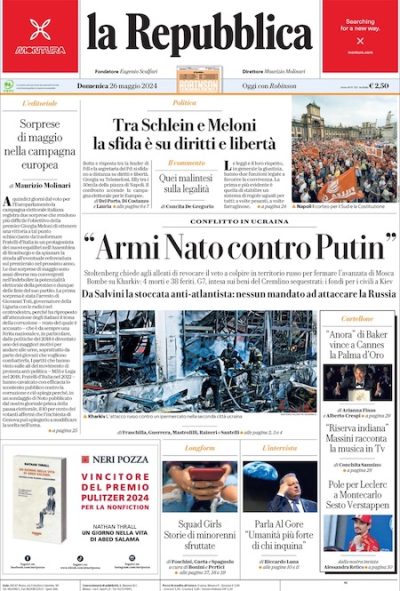 Una delle notizie principali in apertura sui giornali di oggi è la dichiarazione del segretario generale della NATO Jens Stoltenberg, che in un’intervista all’Economist ha invitato i paesi membri della NATO a sospendere il divieto per l’Ucraina di usare le armi ricevute come aiuti militari per attaccare la Russia. Molto spazio è dedicato anche al messaggio pubblicato sulle piattaforme social dalla presidente del Consiglio Giorgia Meloni riguardo all’influenza del suo governo sulla RAI, ma si parla anche dei vincitori di Cannes e della morte di Angelo Onorato, marito della parlamentare europea Francesca Donato.