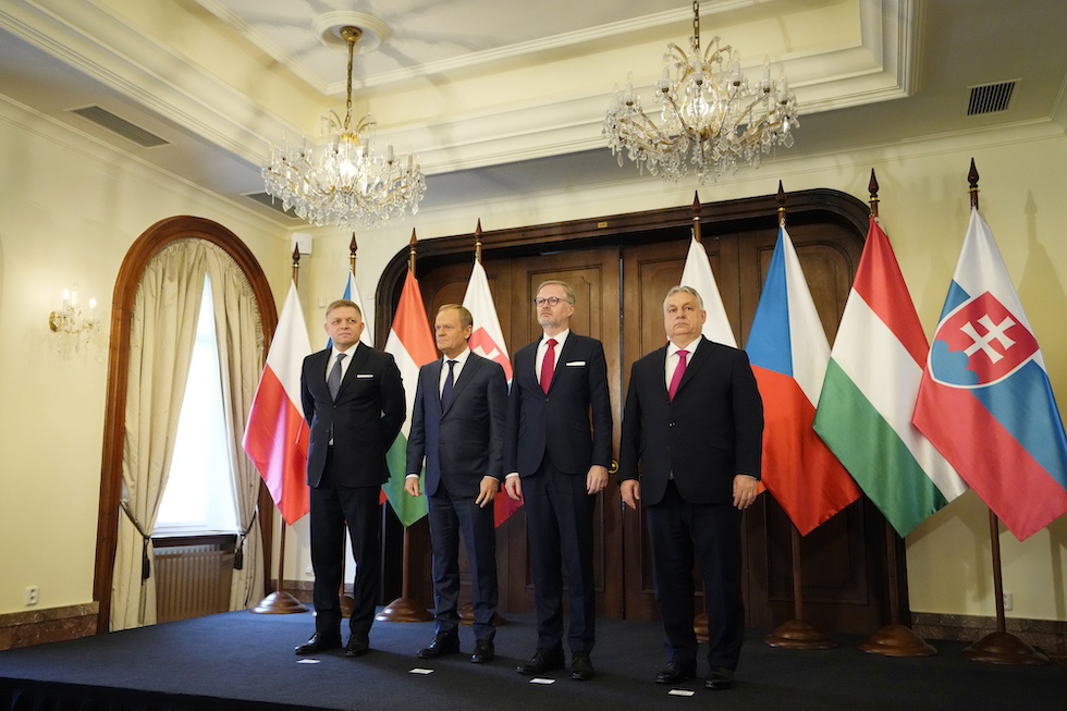 Da sinistra: Robert Fico, Donald Tusk, Petr Fiala, Viktor Orbán a Praga, in Repubblica Ceca, a febbraio 2024 (AP Photo/Petr David Josek)