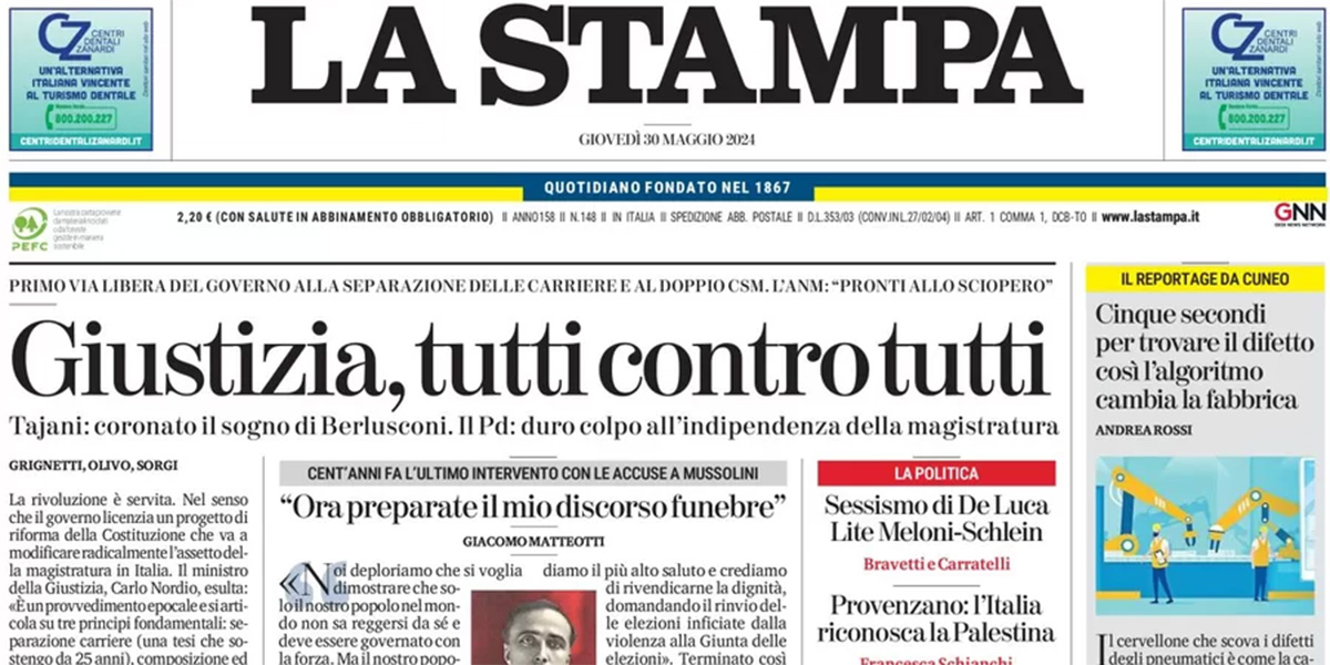 Il disegno di legge di riforma costituzionale sulla giustizia approvato ieri dal Consiglio dei ministri è la notizia principale sulla quale aprono tutti i giornali di oggi: il provvedimento prevede la separazione delle carriere fra magistratura requirente e giudicante, modifiche alla composizione del Consiglio Superiore della Magistratura e alla selezione dei suoi membri, e l’istituzione di un organismo separato per i provvedimenti disciplinari. Nei titoli quasi tutti sottolineano l’opposizione alla riforma della magistratura, che minaccia uno sciopero per contrastarla. Avvenire apre invece sulle guerre in corso nella Striscia di Gaza e in Ucraina, mentre i giornali sportivi si dividono fra la sconfitta della Fiorentina nella finale della Conference League di calcio e le notizie sul mercato degli allenatori per la prossima Serie A.