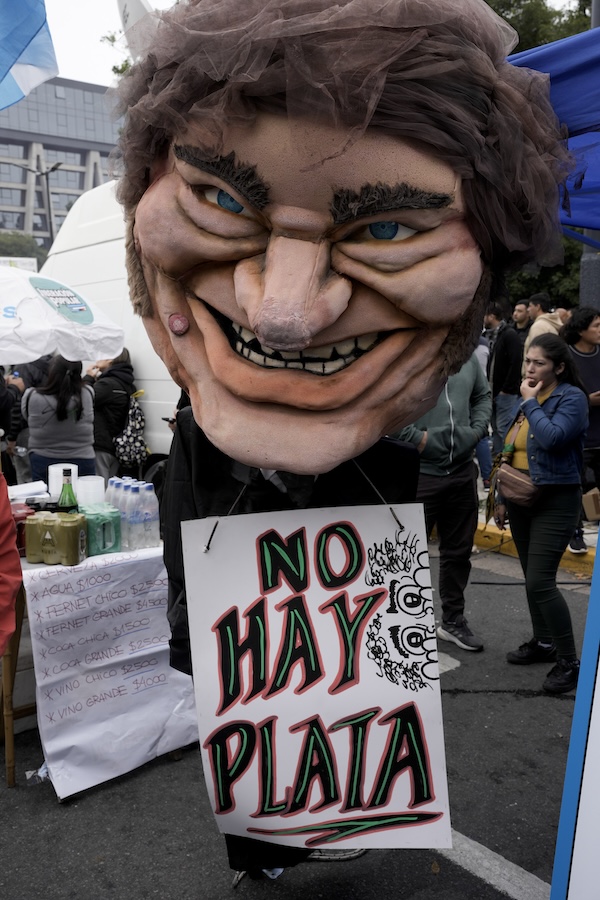 Un pupazzo del presidente durante una protesta degli scorsi mesi. Il cartello dice: “Non ci sono soldi” (AP Photo/Rodrigo Abd)