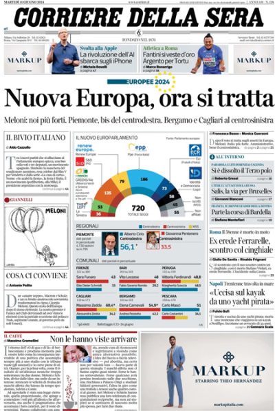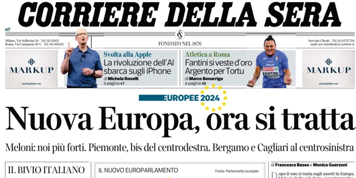 Tutti i giornali di oggi si occupano in apertura dell’analisi del voto di sabato e domenica per il rinnovo del Parlamento europeo e per le elezioni amministrative in diversi comuni e alla regione Piemonte. Gli aspetti principali su cui si concentrano i titoli sono la composizione del nuovo parlamento, con l’aumento della rappresentanza dei partiti di destra, le prime ipotesi sulla prossima Commissione europea e sul ruolo di Fratelli d’Italia nelle trattative per la composizione della maggioranza, l’esame dei risultati per i vari partiti italiani, positivi per Fratelli d’Italia, Partito Democratico, Alleanza Verdi e Sinistra e Forza Italia e negativi per Movimento 5 Stelle e Lega, e l’esito delle elezioni amministrative.