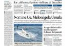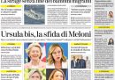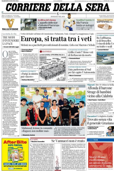 La notizia principale sui giornali di oggi è l’incontro informale di ieri sera fra i capi di stato e di governo dell’Unione Europea per trovare un intesa sulle nomine per le cariche più importanti, con la probabile conferma alla presidenza della Commissione Europea di Ursula von der Leyen sostenuta da popolari, liberali e socialisti e l’opposizione del gruppo dei conservatori guidato dalla presidente del Consiglio italiana Giorgia Meloni a un accordo complessivo che li escluda. L’altra notizia che prende molto spazio sulle prime pagine è il naufragio di due imbarcazioni di migranti al largo delle coste della Calabria e di Lampedusa nei quali sono morte dieci persone e oltre sessanta sono disperse. Il Messaggero titola invece sull’approvazione europea della fusione fra le compagnie aeree Ita e Lufthansa, il Fatto si occupa della fornitura di armi italiane all’Ucraina, e i giornali sportivi titolano sulla seconda partita dell’Italia agli Europei maschili di calcio con la Spagna, in programma giovedì.