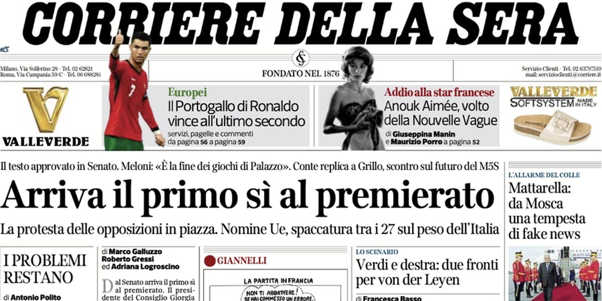 La prima approvazione da parte del Senato del disegno di legge di riforma costituzionale sui poteri del presidente del Consiglio e sulla sua elezione diretta e la manifestazione di ieri delle opposizioni per protestare contro questo provvedimento e contro la legge sull’autonomia differenziata sono la notizia principale in apertura sui giornali di oggi. Il Sole 24 Ore si occupa invece dei dati delle dichiarazioni dei redditi dei tassisti relative al 2022, il Fatto titola sui costi dell’organizzazione dell’ultimo G7 in Puglia, e la Verità torna sui vaccini per il coronavirus.
