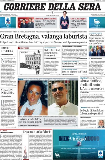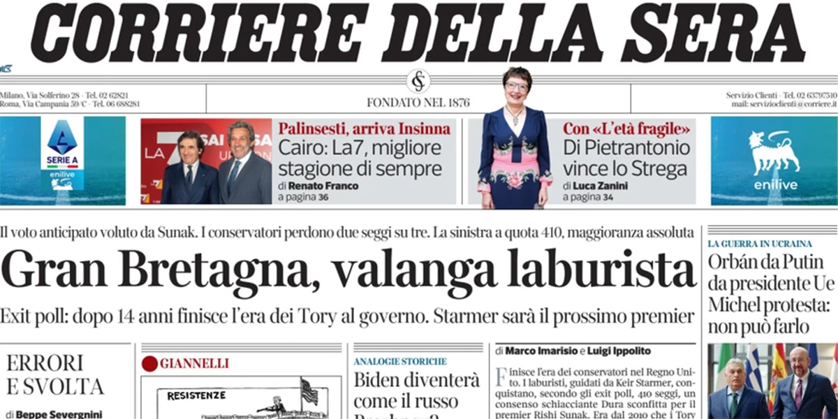 Ci sono notizie diverse in apertura sui giornali di oggi: su quasi tutte le prime pagine molto spazio è dedicato alle elezioni politiche nel Regno Unito, con la netta vittoria del Partito Laburista di Keir Starmer, ma qualche giornale apre invece sulle critiche del leader della Lega Salvini al discorso del presidente della Repubblica Mattarella dell’altro ieri sulla democrazia. Repubblica segue la visita prevista per oggi del primo ministro ungherese e attuale presidente del Consiglio dell’Unione Europea Orbán al presidente russo Putin, il Manifesto titola invece sulle condizioni di detenzione dei palestinesi catturati dai militari israeliani nella Striscia di Gaza, Domani dà per certa la candidatura di Raffaele Fitto a commissario europeo, e Libero continua la sua campagna contro l’eurodeputata Ilaria Salis.