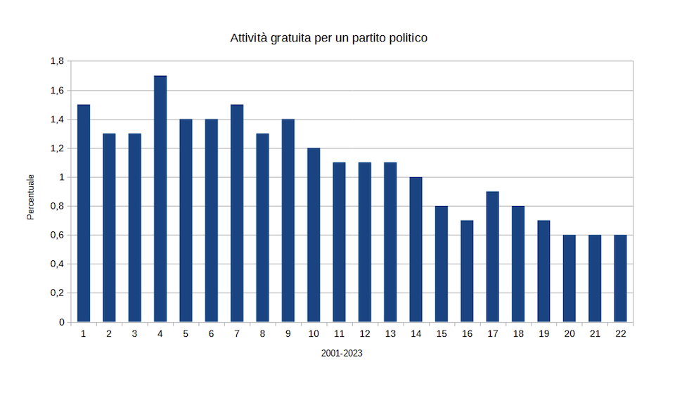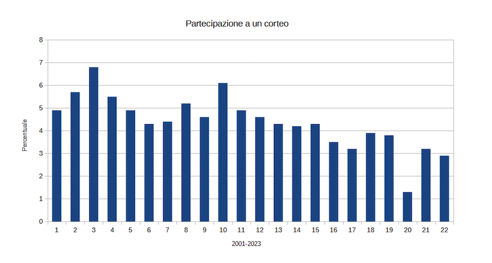 Giocando un po’ con le query del sito possiamo anche confrontare i dati su «discussione e attività politica» dal 2001 al 2022 relativi alla popolazione sopra i 14 anni. Ecco l’andamento di due fattori interessanti, l’attività gratuita per un partito politico e la partecipazione a un corteo (le colonne sono dodici perché mancano i dati del 2005):