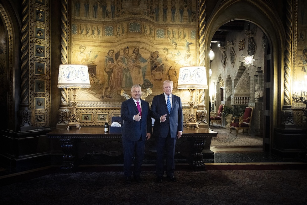 Viktor Orbán con Donald Trump, nella residenza di Mar-a-Lago in Florida, l’11 luglio (EPA/Zoltan Fischer)