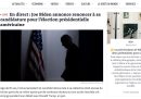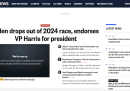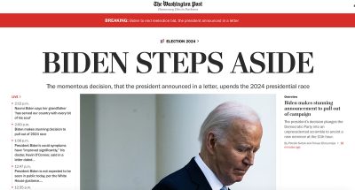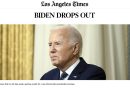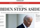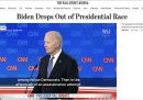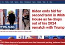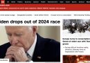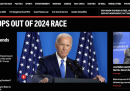 Praticamente tutti i siti di news del mondo hanno il ritiro della candidatura di Joe Biden in apertura, domenica sera: notizia di dimensioni e interesse enormi, da una parte attesa e dall’altra in dubbio ogni giorno da tre settimane. Le redazioni si sono precipitate a pubblicarla, e che potesse avvenire l’annuncio domenica si era detto nei giorni scorsi: ma complici le continue smentite, e la domenica con le redazioni più sguarnite, l’impressione è che ci si sia dedicati finora più a pubblicare la notizia che a pensare un modo originale di confezionarla. E forse tra i grandi siti internazionali è quello del britannico Telegraph ad averla composta in una forma di maggiore impatto.