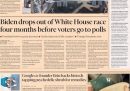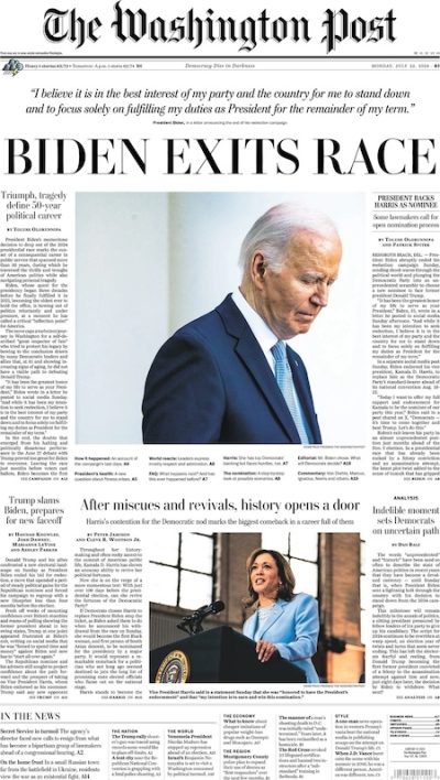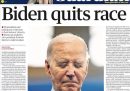 Lunedì le prime pagine di quasi tutti i giornali internazionali – come anche quelle dei giornali italiani – hanno ovviamente in apertura la notizia di Joe Biden che ha ritirato la sua candidatura alla rielezione per conto del Partito Democratico alle elezioni presidenziali statunitensi. I titoli sono tutti piuttosto simili, e in alcuni casi addirittura identici. Negli Stati Uniti molti giornali non hanno ancora pubblicato la propria edizione cartacea, ma avevano già coperto la notizia domenica sera sui propri siti internet (anche se arrivandoci un po’ impreparati).