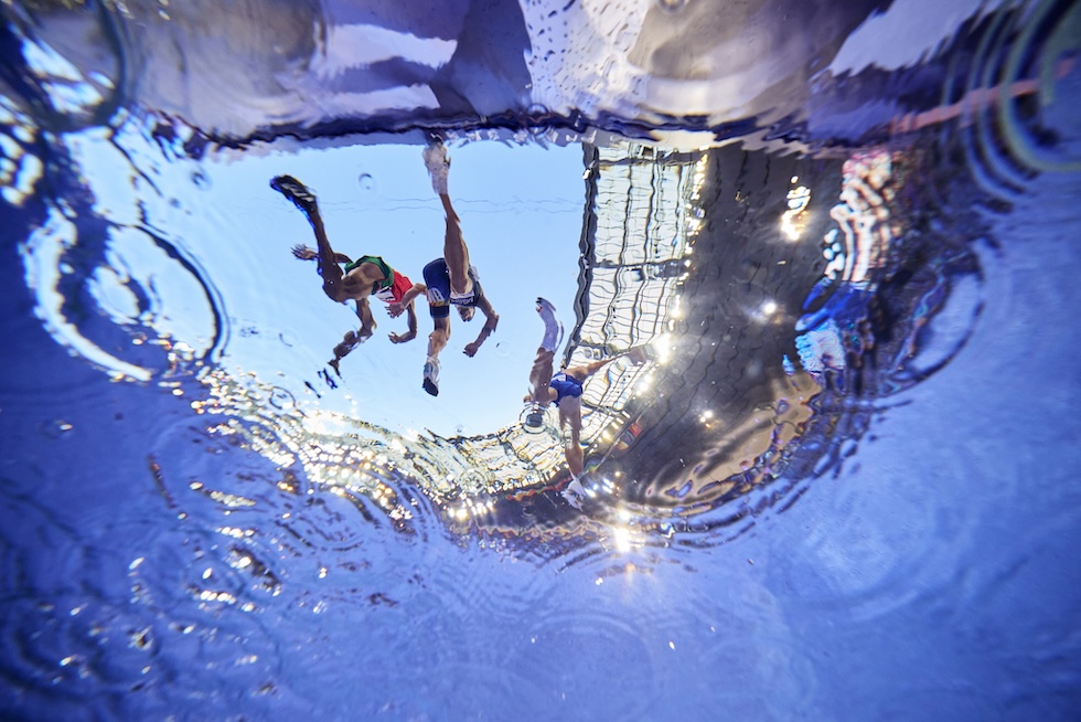 Atleti della 3000 siepi visti dal fondo di una delle vasche (Adam Pretty/Pool Photo via AP)