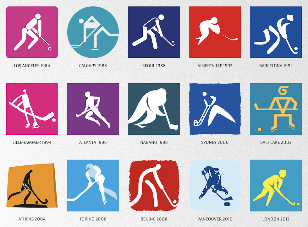 L’evoluzione dei pittogrammi per le gare di hockey e hockey su prato da Los Angeles 1984 a Londra 2012 (theolympicdesign.com)