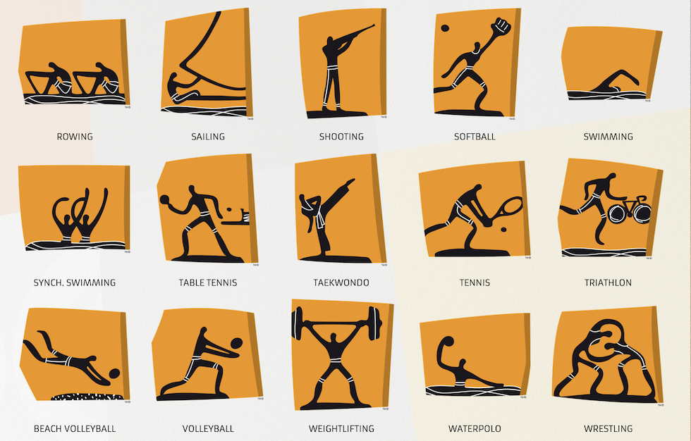Anche i pittogrammi di Sydney 2000 erano basati sulla storia dell’Australia, e in particolare su un oggetto, il boomerang, che fu sfruttato nella gran parte dei simboli per rappresentare le gambe delle persone impegnate nelle varie discipline, dalla ginnastica artistica al sollevamento pesi. Fu un po’ lo stesso per Atene 2004, il cui stile e colori ricordavano quelli delle figure dipinte sulle ceramiche dell’antica Grecia.