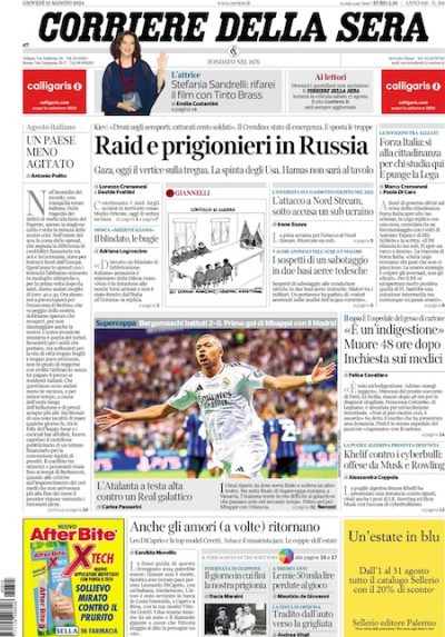 Gran parte delle prime pagine di oggi dà ampio spazio a questioni di guerra: alcuni – come il Corriere e La Stampa – dedicano l’apertura al successo degli attacchi in Russia da parte dell’Ucraina; altri – come per esempio Domani, Avvenire e Il Manifesto – aprono invece con i complicati negoziati per una tregua a Gaza, che iniziano oggi. È molto presente anche una questione italiana, con cui apre Repubblica, cioè la discussione tra i partiti italiani sui cosiddetti ius soli e ius scholae.