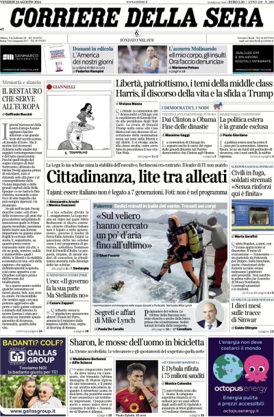 Oggi gran parte dei quotidiani nazionali e locali ha in prima pagina le divisioni tra vari membri della coalizione di governo rispetto allo ius scholae, ovvero la possibilità di ottenere la cittadinanza italiana dopo aver completato almeno cinque anni di scuola in Italia. In particolare si parla del leader di Forza Italia Antonio Tajani e del governatore leghista del Veneto Luca Zaia, che si sono detti entrambi favorevoli, in contrasto con molti dei propri alleati. Molto spazio viene dedicato anche agli ultimi aggiornamenti sulla Bayesian, la barca a vela affondata lunedì vicino a Palermo, includendo soprattutto delle ricostruzioni sulle ultime ore di vita delle persone morte a bordo.